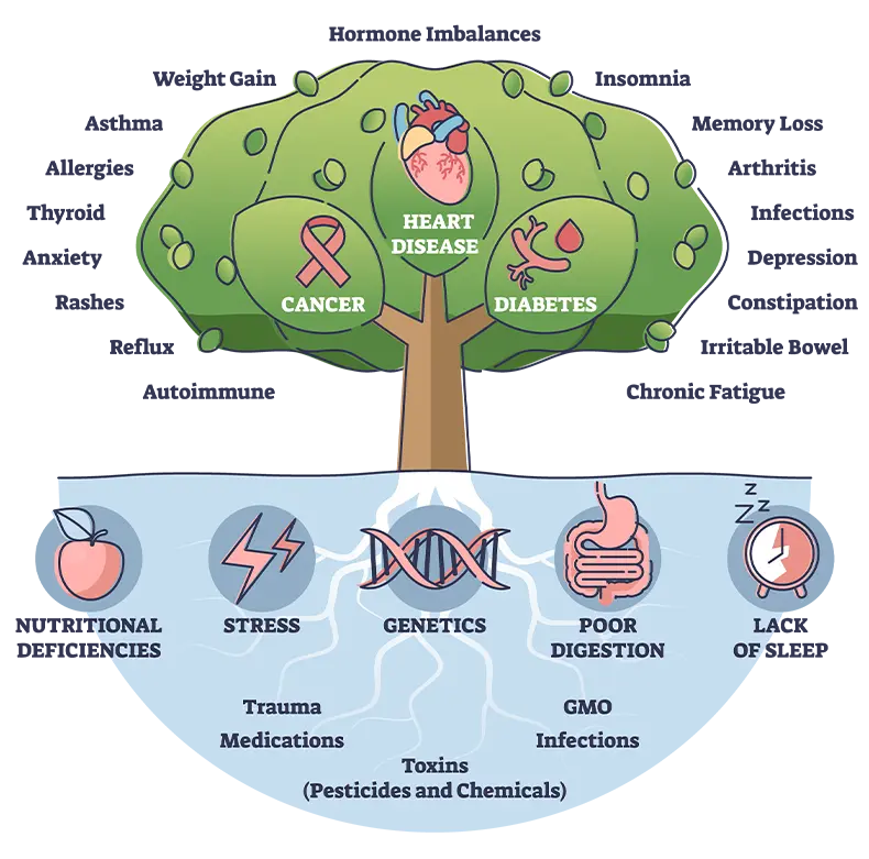 Functional Medicine is a patient-centered approach that focuses on the patient's underlying root cause to restore their health. It looks at a person's overall physical, mental, emotional, and sometimes even spiritual health. Functional Medicine assesses every possible reason contributing to your overall health, such as diet, hormonal changes, genetics, prescription, over-the-counter medications, and other lifestyle routines.